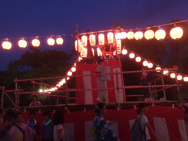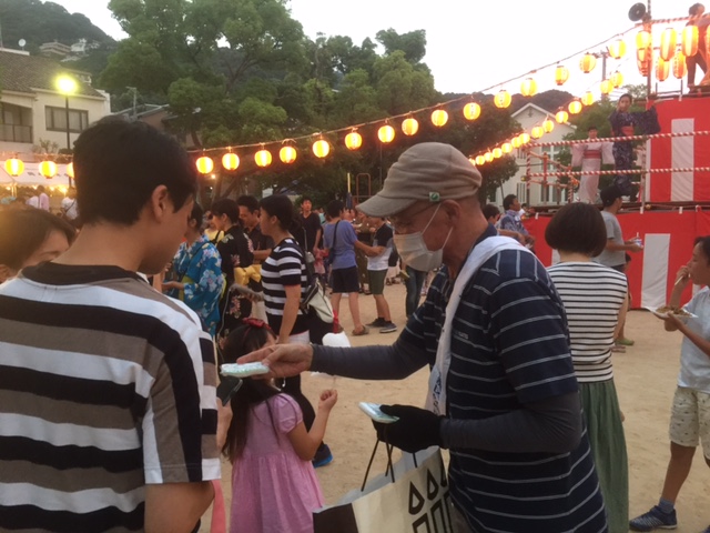 岡本区納涼盆踊り大会でテッィシュを配り、広報宣伝活動をしました。